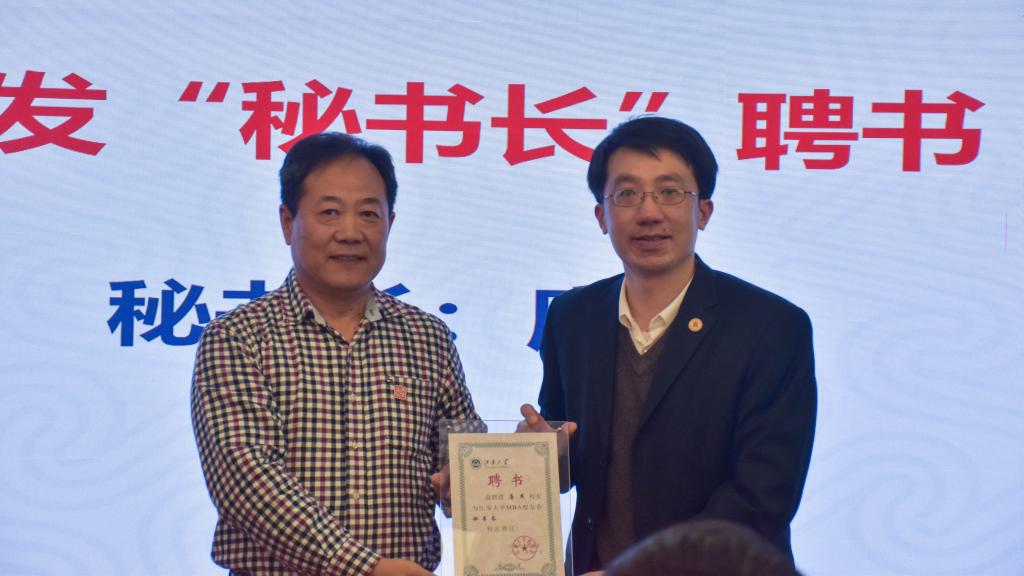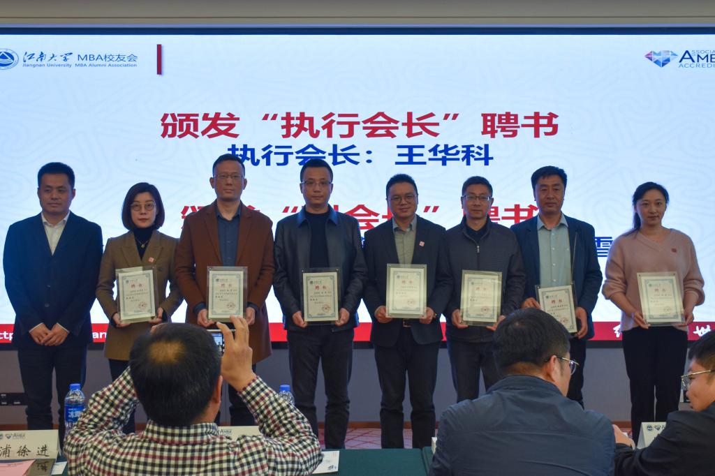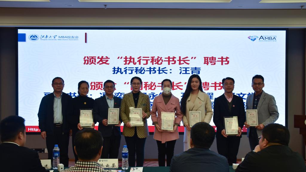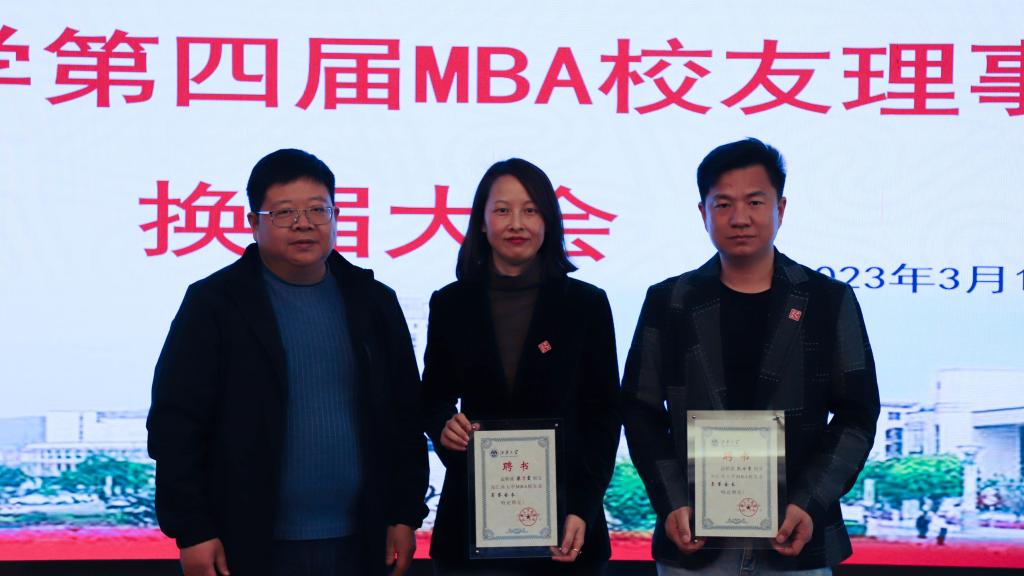 江南大学校友会秘书长林云鉴宣读了第四届MBA校友会理事会名单,云顶国际党委刘长青书记分别向第二届MBA校友会会长孔令吉和第三届MBA校友会会长梁乃霞颁发了“名誉会长”聘书,校社会合作与校友联络处周云龙处长向新任于新民会长颁发聘书,林云鉴秘书长向唐杰老师颁发了秘书长聘书,浦徐进院长分别向王华科、马彪等校友颁发了执行会长和副会长聘书,任增亮副处长分别向汪青、田永红等校友颁发了执行秘书长和副秘书长聘书,会上还为校友会理事、班级联络人颁发了聘书。